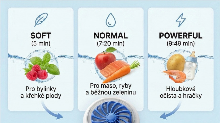 - "Soft" Mode (5 min): Gentle care for herbs and soft fruits (raspberries, strawberries). Low fan speeds prevent damage.