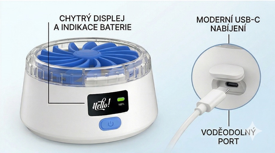 The device uses electrolysis technology to generate ozone directly in the water bath. An integrated fan ensures the circulation of ozonated water, which penetrates all folds of the food. The process is fully automatic, controlled by a single button, and requires no chemical refills – all you need is clean water and a charged battery.