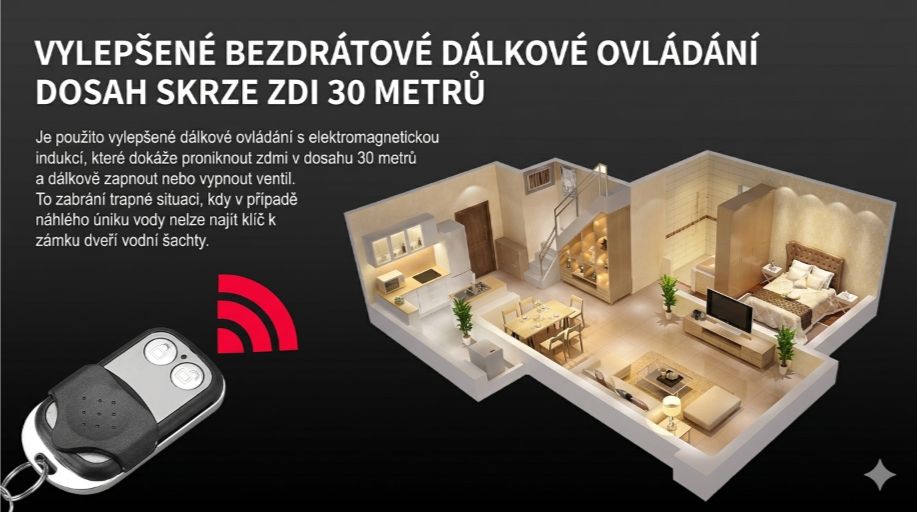 - Vzdálená správa: Dálkové ovládání s dosahem až 30 metrů pro snadné zapnutí nebo vypnutí vody.